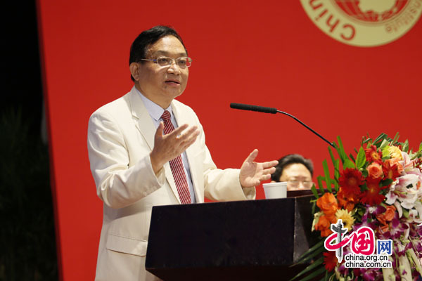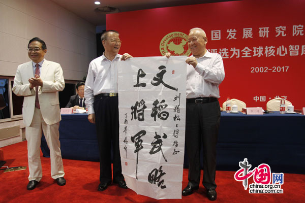 民革中央专职副主席、十二届全国人大常委会常委修福金,全国政协原副秘书长、全国政协原常委李昌鉴,原中国人民解放军军事科学院院长刘精松上将,原经济日报总编辑、中国发展研究院院长艾丰,中国发展研究院执行院长章琦,中国发展研究院新任院长王彤,国家行政学院原副院长周文彰等领导分别在会上致辞和发表讲话。