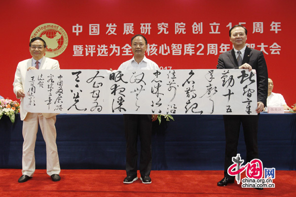 2017年9月2日下午,中国发展研究院创立十五周年暨评选为全球核心智库两周年庆贺大会,在京隆重召开。全国人大、全国政协、中央党校、发改委、商务部、卫计委、环保部、中国社科院、中医药管理局、国家行政管理学院、中国社会经济调查研究中心、全国侨联、国际扶贫基金会等有关领导及来自北京、上海、吉林、河南、深圳、重庆的有关部门负责人及智库专家、社会名流共200余名嘉宾出席了庆祝大会。十一届全国人大常委会副委员长周铁农专门为中国发展研究院创立15周年题写了“凝聚智慧 影响中国”的题词。