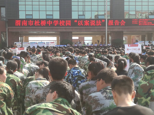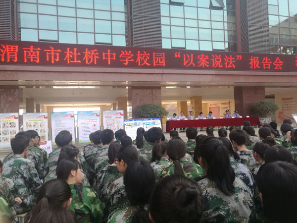 踏着秋的脚步,沐浴着金秋的暖阳。9月21日,为了加强学生的法制教育,提高学生知法、守法意识,渭南市杜桥中学成功举办了校园“以案说法”普法专题报告会,学校领导及高一、高二两千多名师生参加了报告会。临渭区法院、公安、交警等相关单位特邀嘉宾相聚一堂,联手为同学们送上了一份“说法盛宴”。
