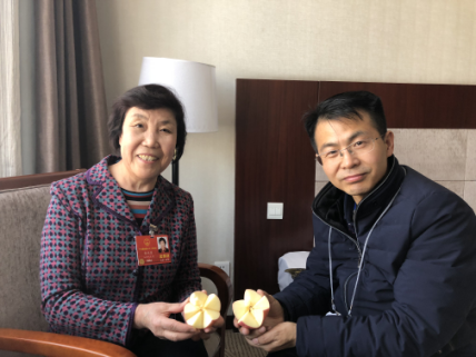 全国人大代表郭凤莲和中国改革报记者林爱民展示“五星苹果”