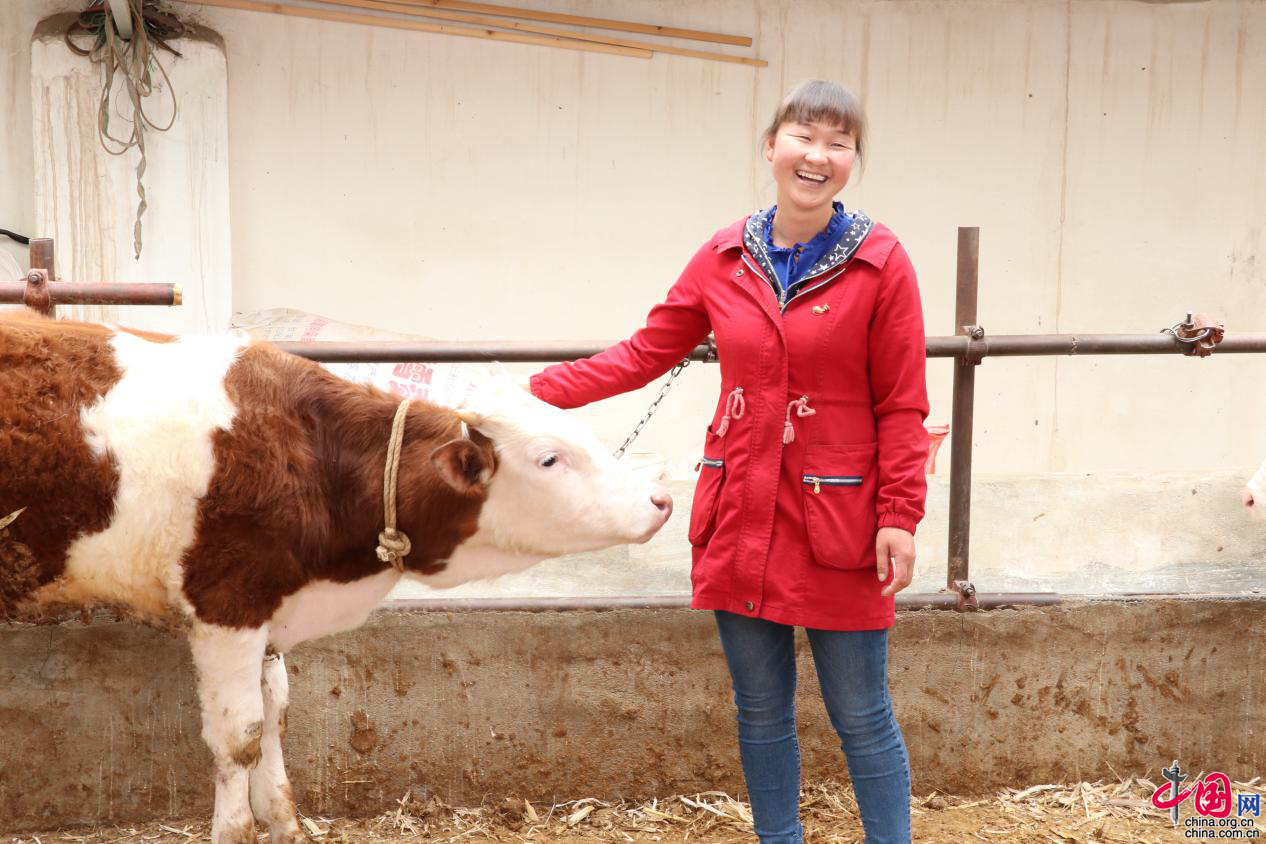 杨营村贫困户安晖一边讲述国家政策和辛勤劳作给生活带来的改变,一边喜悦地照料自家的牛群。(中国网 刘晨曦摄)