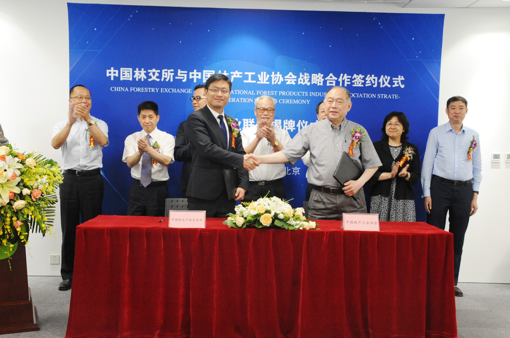 中国林交所总裁景岚和林产工业协会秘书长石峰代表双方在协议上签字,原国家林业局局长王志宝、国家林业和草原局农村林业改革发展司司长刘拓、国家林业局和草原局国际合作司巡视员戴广翠、中国林交所股东单位等领导共同见证了签约仪式。