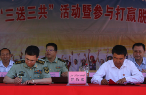 14日上午,全村人齐聚在村委会大院。签约仪式上,武警新疆总队副政治委员张明刚向村委会捐赠了脱贫攻坚项目建设资金,并与村党支部书记艾海提·尼亚孜签订了脱贫攻坚共建协议。