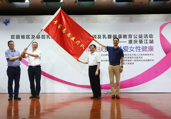 为贯彻落实党中央国务院关于打赢精准扶贫攻坚战的重要战略部署,在精准扶贫中积极发挥健康扶贫作用、开展实施健康扶贫工程,国家卫生健康委员会中国人口宣传教育中心和中国抗癌协会乳腺癌专业委员会(CBCS)首次共同主办、中国抗癌协会指导及上海罗氏制药有限公司支持的“健康扶贫,关爱女性健康”贫困地区及基层乳腺癌规范化诊疗培训及乳腺健康教育公益活动,于7月5日首站在重庆市綦江区人民医院成功举办。在重庆市綦江区卫计委和綦江区人民医院的大力支持下,主办方中国抗癌协会乳腺癌专业委员会,在主任委员重庆医科大学附属第一医院任国胜教授带领下,组织多名重医一院乳腺诊疗知名专家,以及中青年医生组成多学科“专家志愿医疗队”来到重庆綦江区人民医院,通过优质医疗资源下沉,帮助当地医护人员提升乳腺癌规范化诊疗和护理能力,增加基层医疗机构为当地百姓服务的“软实力”,同时通过健康教育提高当地女性对乳腺癌正确防治的观念。重庆市人口宣传教育中心副主任谢英、重庆市綦江区卫生和计划生育委员会党委专职副书记陈军、重庆市綦江区人民医院院长王江、重庆市綦江区人民医院党委书记李维学、重庆市綦江区人民医院乳腺外科主任吴立然,以及重庆市綦江区人民医院主要领导嘉宾出席了本次公益活动启动仪式。