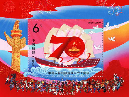 中国邮政定于2019年10月1日发行《中华人民共和国成立七十周年》纪念邮票1套5枚,小型张1枚。