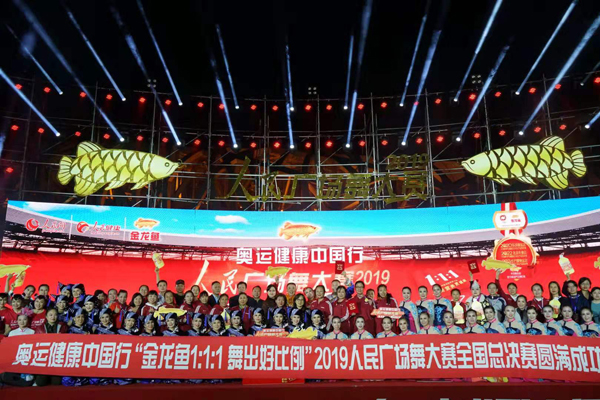10月31日,由人民网•人民健康、金龙鱼黄金比例调和油联合主办,中国妇女网和女性之声支持的“奥运健康中国行•金龙鱼1∶1∶1舞出好比例”2019人民广场舞大赛(以下简称“2019人民广场舞大赛”)总决赛在国家体育场南广场圆满收官。活动主办方负责人、与会嘉宾、大赛评委、参赛选手以及现场观众上千人共同演绎人民广场舞,为微凉的秋日点燃了全民健身的火爆热潮。
