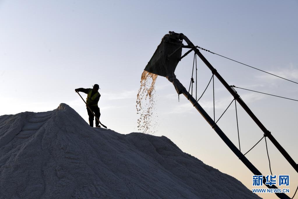 5月18日,在山东省滨州市沾化区滨海镇金盛海洋盐场,工人在整理盐垛。