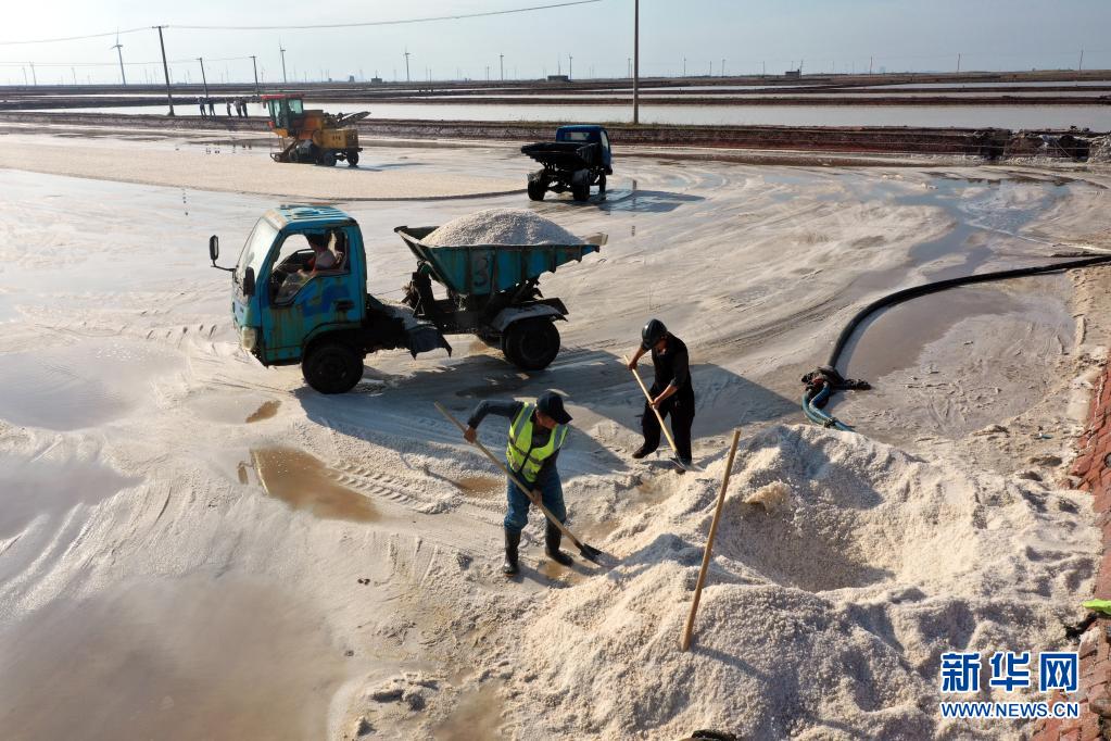 5月18日,在山东省滨州市沾化区滨海镇金盛海洋盐场,工人在收获春盐。