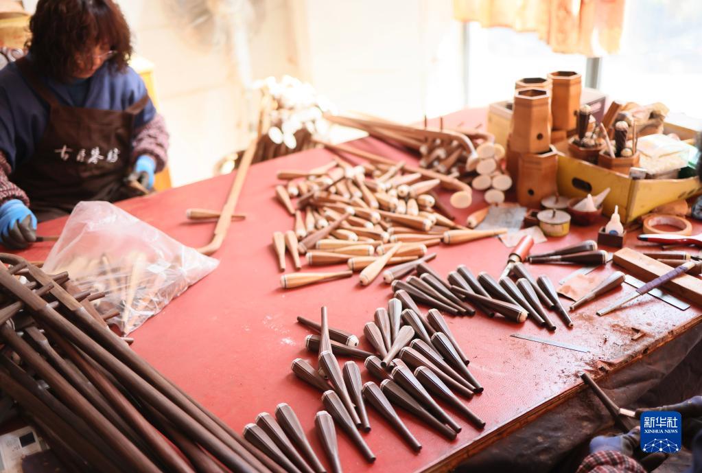 3月28日,在江苏无锡梅村街道二胡产业园,工人在制作琴轴。