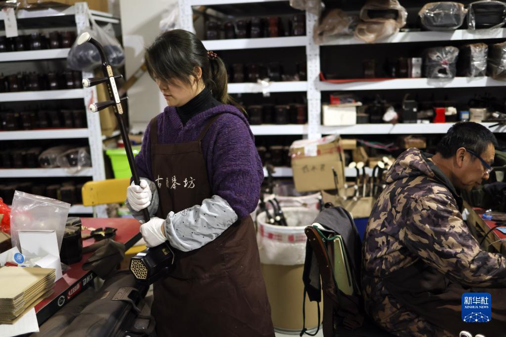 3月28日,在江苏无锡梅村街道二胡产业园,工人在检查成品二胡。
