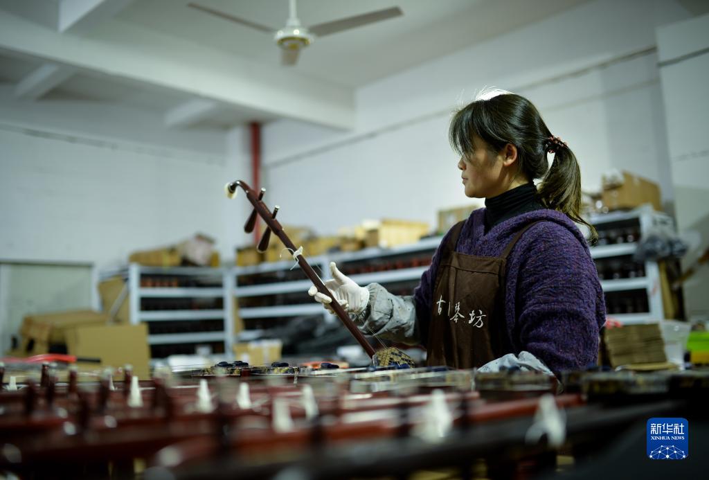 3月28日,在江苏无锡梅村街道二胡产业园,工人在检查二胡产品。