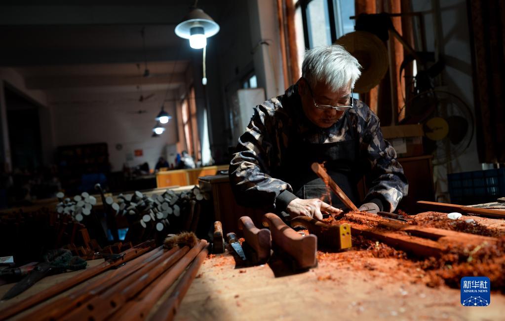 3月28日,在江苏无锡梅村街道二胡产业园,工人在制作琴杆。