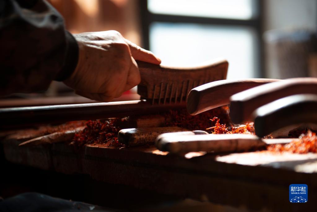 3月28日,在江苏无锡梅村街道二胡产业园,工人在制作琴杆。