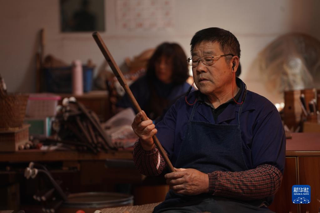 3月28日,工人在江苏无锡梅村街道二胡产业园古月琴坊车间制作琴杆。