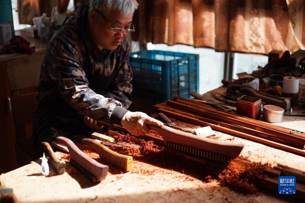 3月28日,在江苏无锡梅村街道二胡产业园古月琴坊车间,工人在制作二胡。