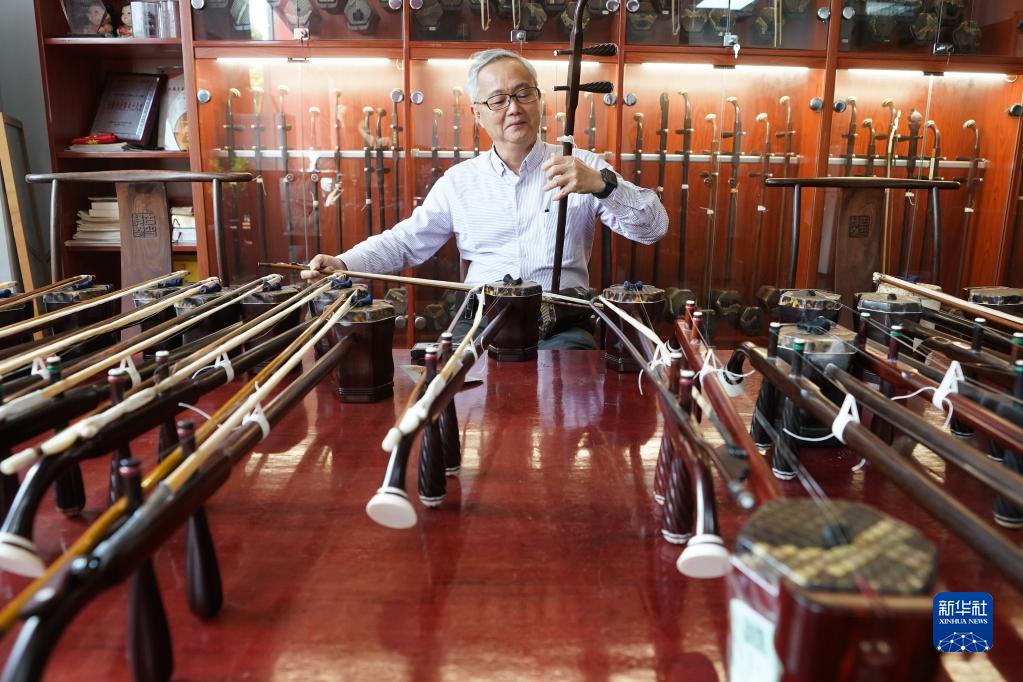 3月28日,在江苏无锡梅村街道二胡产业园古月琴坊车间,来自香港的乐器经销商李开在试琴。