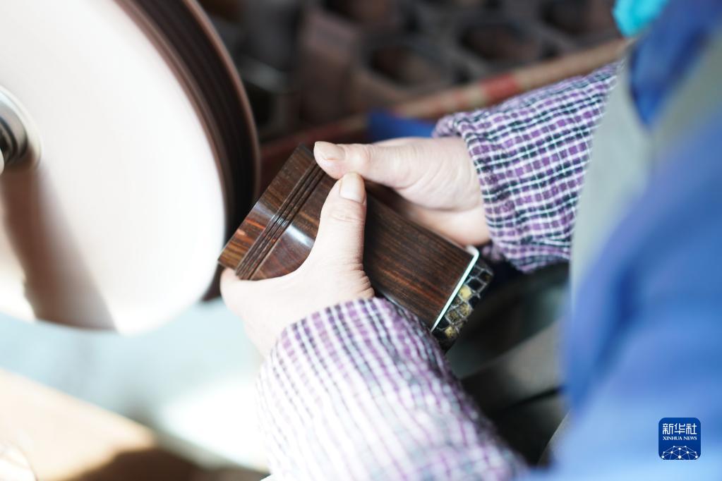3月28日,在江苏无锡梅村街道二胡产业园古月琴坊车间,工人在对琴筒进行抛光。