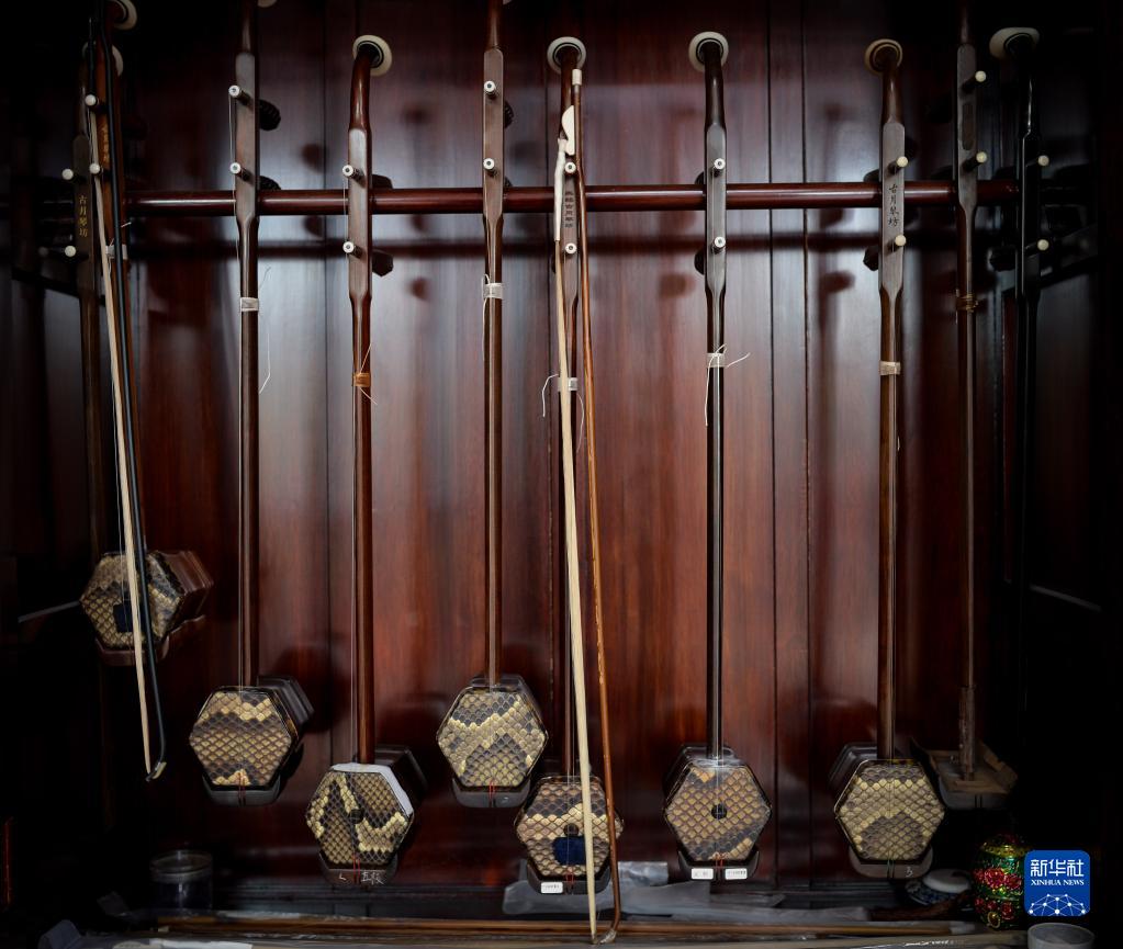 这是3月28日在江苏无锡梅村街道二胡产业园拍摄的成品二胡。