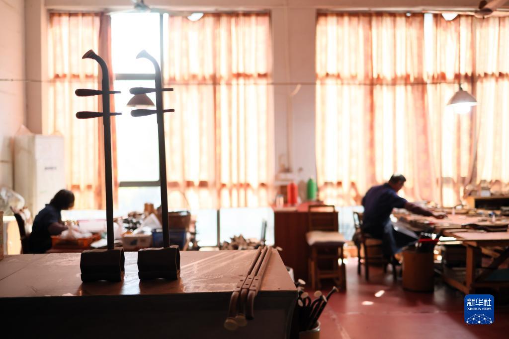 3月28日,在江苏无锡梅村街道二胡产业园,工人在制作二胡。
