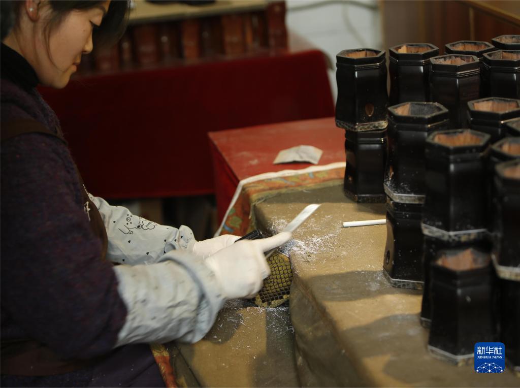 3月28日,工人在江苏无锡梅村街道二胡产业园古月琴坊打磨二胡琴筒。