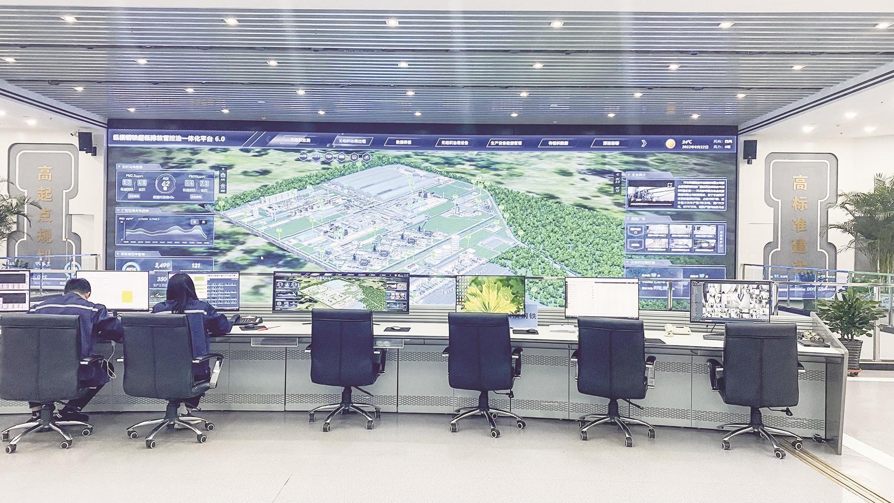 钢铁行业排放机理复杂,排放源多。科学治污,精准减排,重要一环在于对数据进行即时监控和分析。纵横钢铁设置环保智能管控中心,建有无组织、有组织以及清洁运输超低排放管控治一体化平台。环保人员24小时值守,实时调度污染物排放情况,实现“一图观全厂、一图管全厂”。