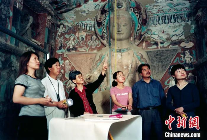 2004年,樊锦诗(左三)指导青年人研究工作。张伟文 摄