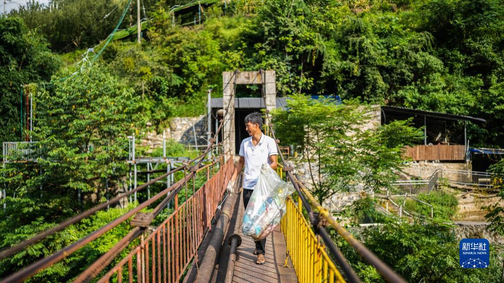 马选军在农家乐附近拾捡垃圾(8月15日摄)。新华社记者 陶亮 摄