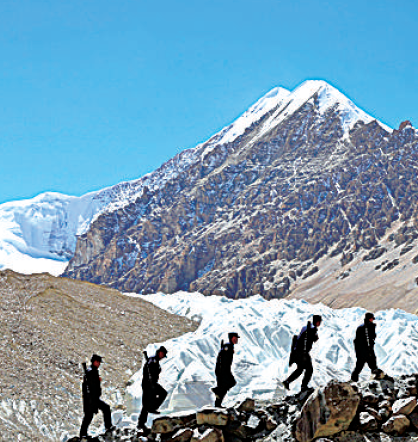 昌龙边境派出所民警在曲登尼玛冰川脚下巡逻。光明日报记者刘宇航摄