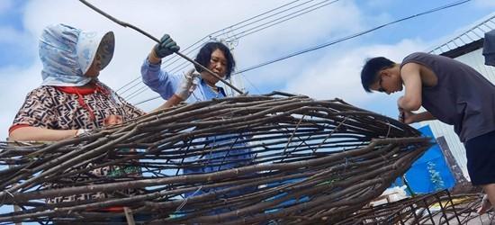 西口村村民参与编织《连年有鱼》。清华大学美术学院项目团队供图