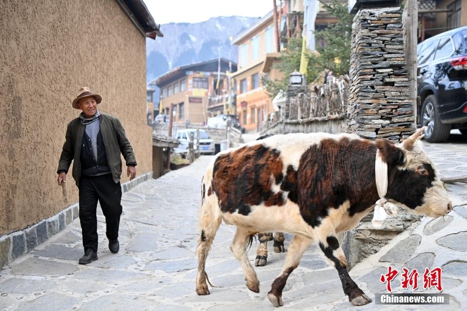 11月3日,甘肃省甘南藏族自治州迭部县,扎尕那村民在外出放牛。中新社记者 九美旦增 摄