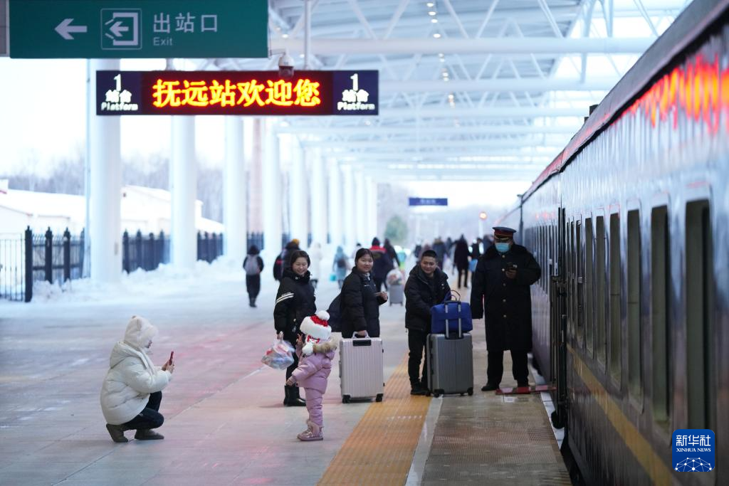 1月23日,在抚远站,乘客在登上K7066次列车前拍照留念。