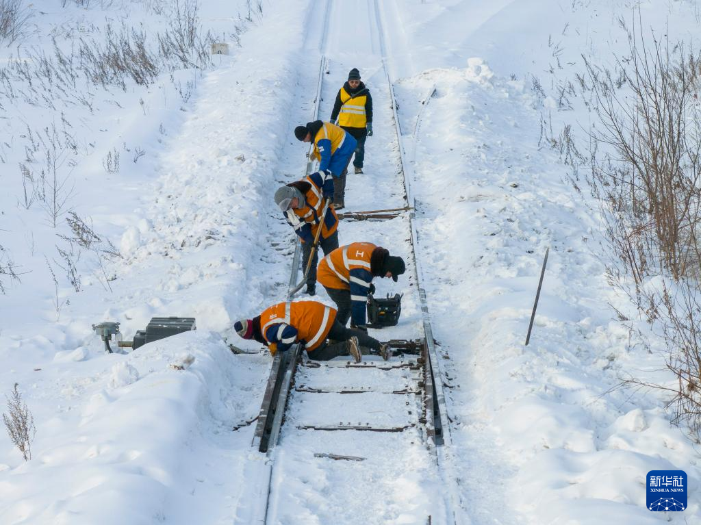 1月23日,在抚远站附近,中国铁路哈尔滨局集团有限公司佳木斯工务段前进镇线路车间抚远工区班组成员进行冬季线路冻害检修作业。