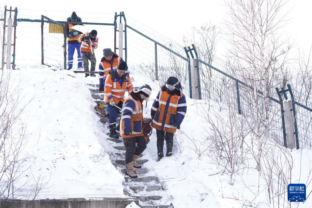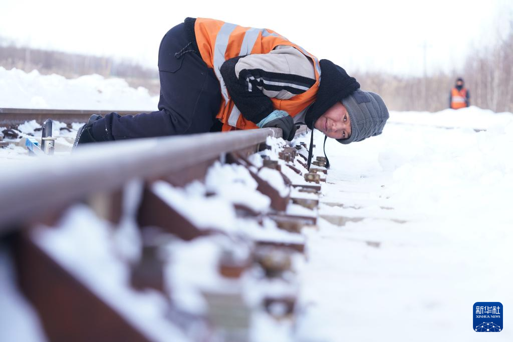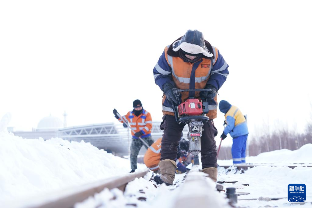 1月24日,在抚远站附近,中国铁路哈尔滨局集团有限公司佳木斯工务段前进镇线路车间抚远工区班组成员进行冬季线路冻害检修作业。