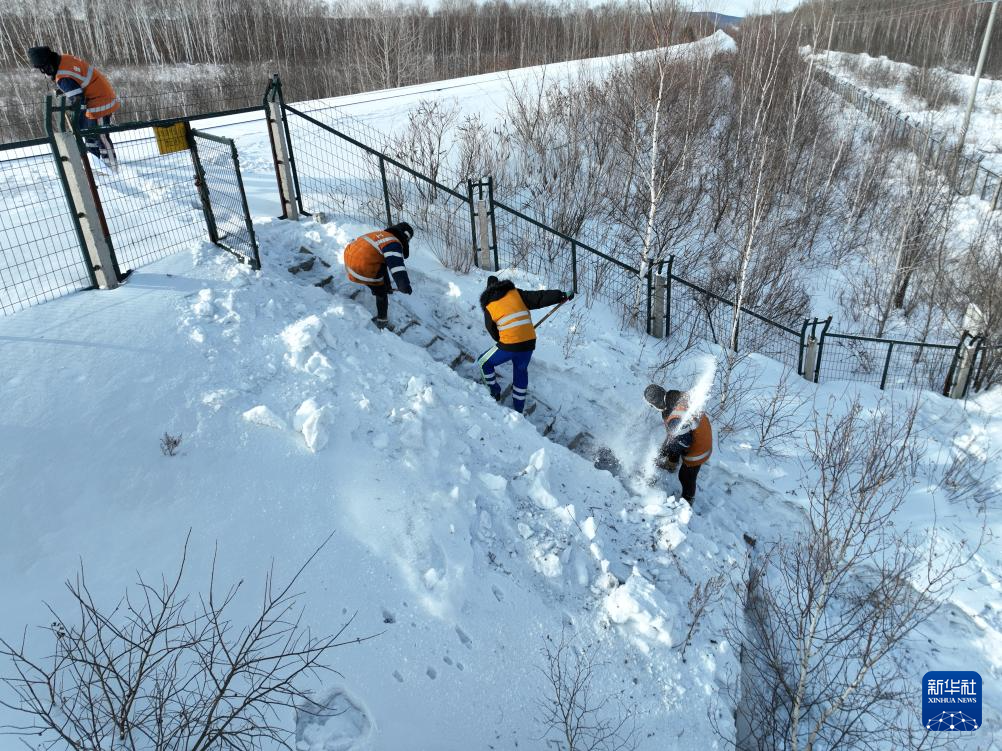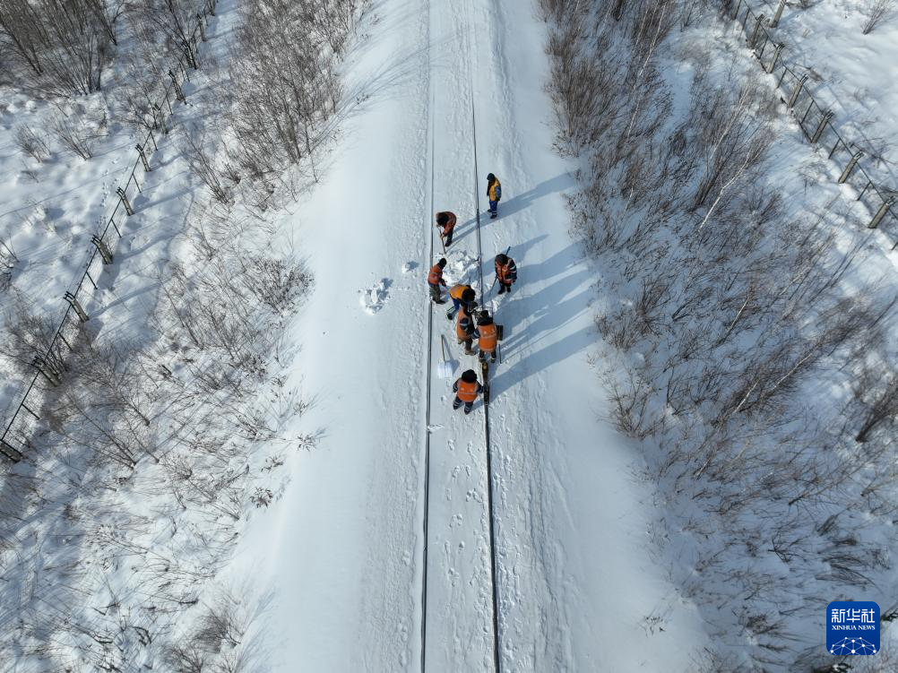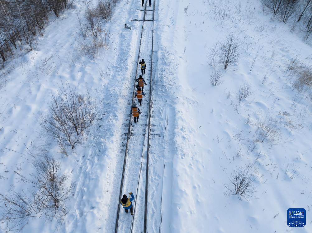 1月24日,在抚远站附近,中国铁路哈尔滨局集团有限公司佳木斯工务段前进镇线路车间抚远工区班组成员进行冬季线路冻害检修作业(无人机拍摄)。