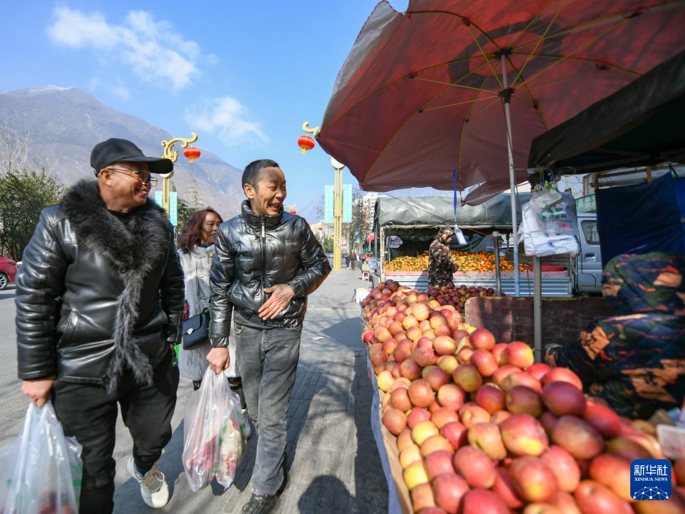 1月28日,在四川阿坝藏族羌族自治州茂县水果交易市场,来自成都的游客在选购苹果。