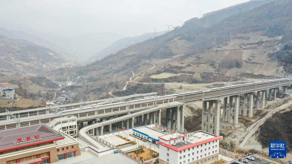 1月28日,一列动车组驶出川青铁路茂县站(无人机照片)。
