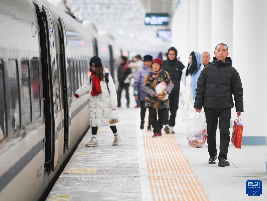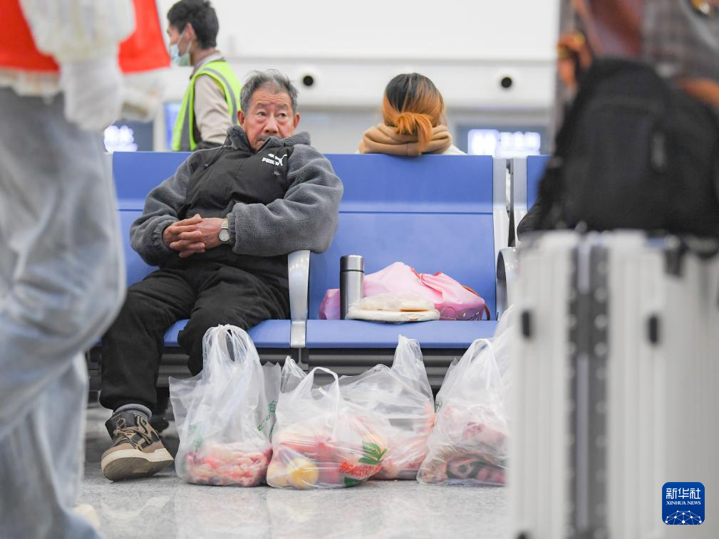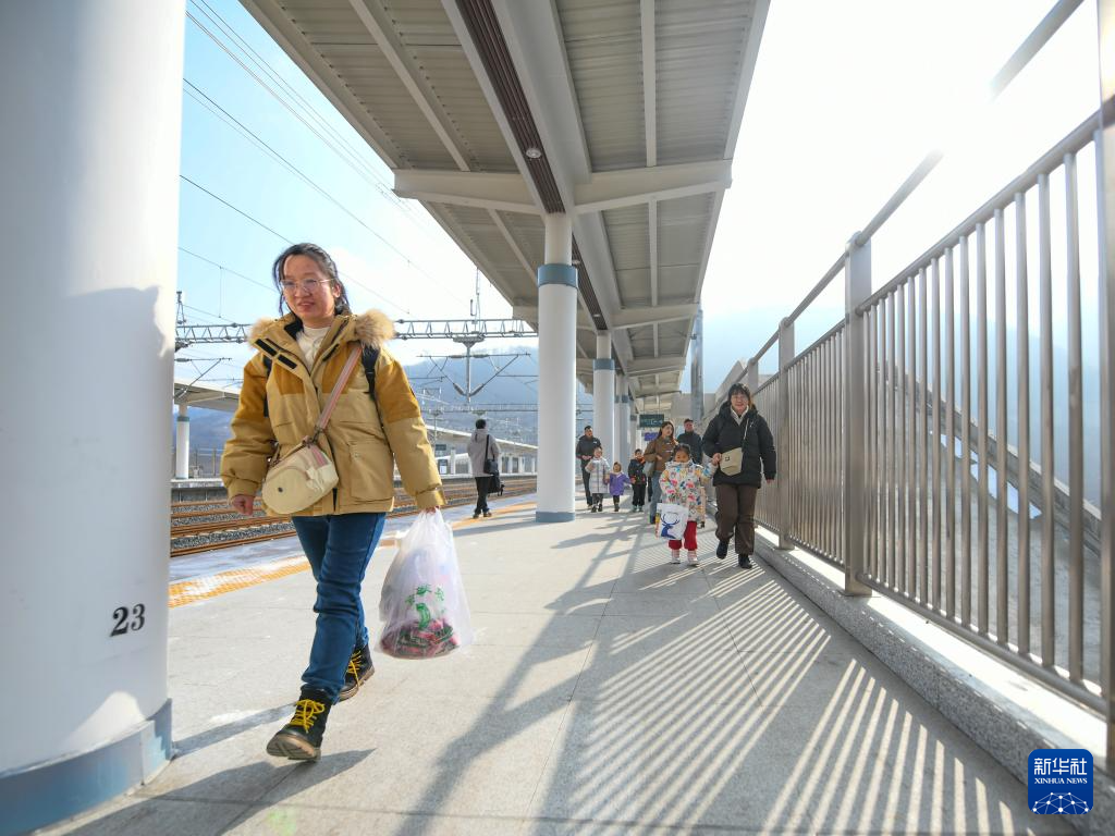 1月28日,在川青铁路茂县站,旅客带着购买的牦牛肉和苹果在候车。