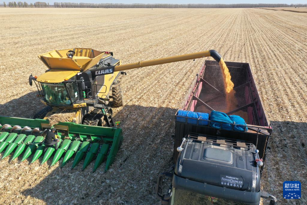 10月12日,农业机械在黑龙江北大荒农业股份有限公司友谊分公司第五管理区进行玉米收获作业(无人机照片)。
