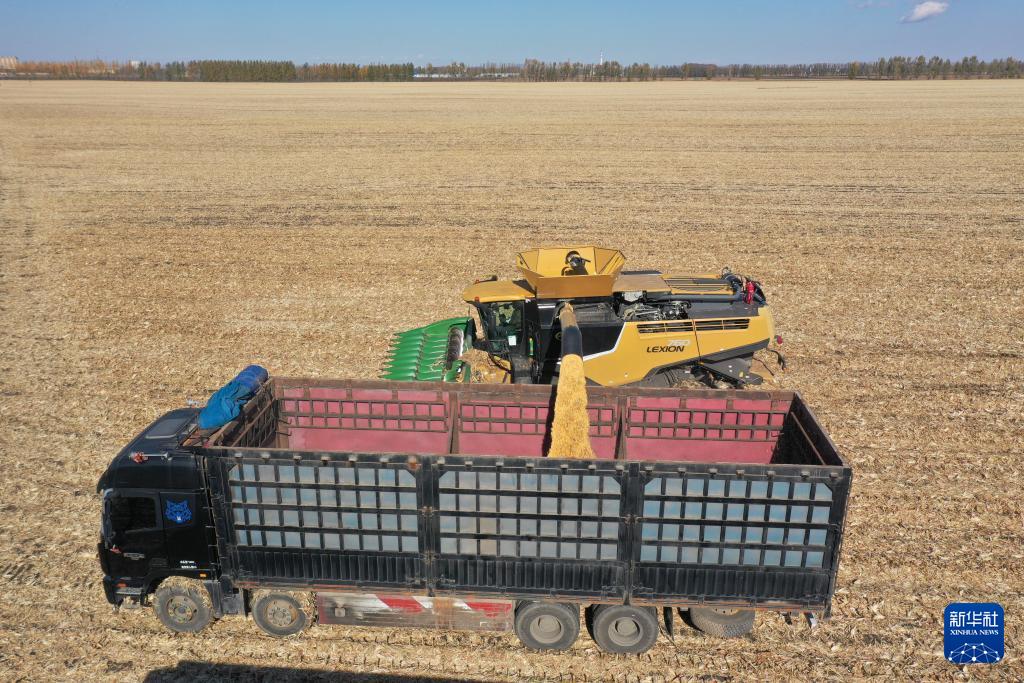 10月12日,农业机械在黑龙江北大荒农业股份有限公司友谊分公司第五管理区进行玉米收获作业(无人机照片)。