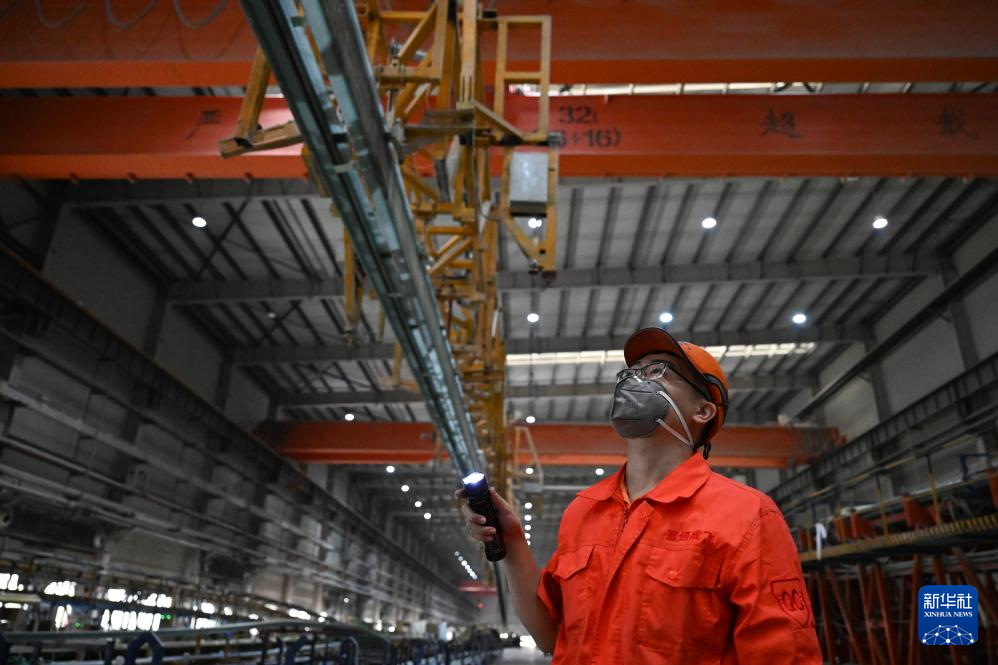 工作人员在重通成飞风电设备江苏有限公司车间内检查设备(11月2日摄)。