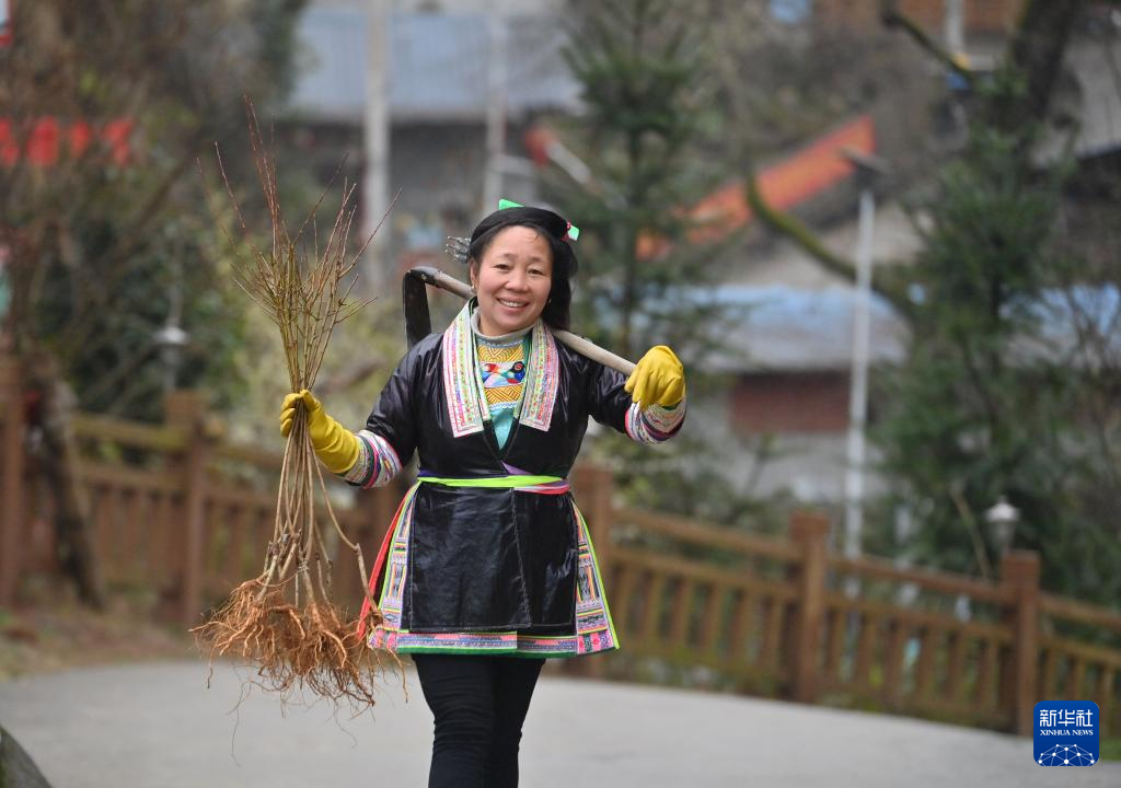 在广西柳州市融水苗族自治县杆洞乡党鸠村乌英苗寨,49岁的妇联主席梁足英拿着树苗上山,准备种植(2025年2月26日摄)。小时候,受当地“重男轻女”观念的影响,很想读书的梁足英只能在家干农活。在人生的前40多年里,她不会讲普通话,也不识字,到过最远的地方就是乡镇集市。从2020年3月起,梁足英通过持续不断的夜校学习,精神面貌发生了极大的改变。五年多来,梁足英带领苗寨的妇女们一起学习传承非遗文化、发展乡村产业。2022年,梁足英获评为广西“最美基层妇联干部”。