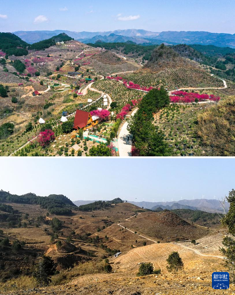 拼版照片:上图为2025年3月12日拍摄的贵州省龙里县颐光山林油茶生态园一角(无人机照片);下图为2019年拍摄的准备开垦为油茶生态园的荒山(资料照片)。