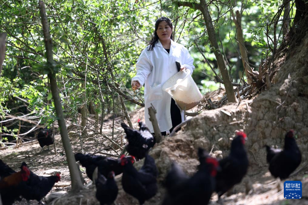 康县阳坝镇梅园太平山鸡养殖专业合作社负责人徐巍芹在树林中给太平鸡喂食(4月22日摄)。