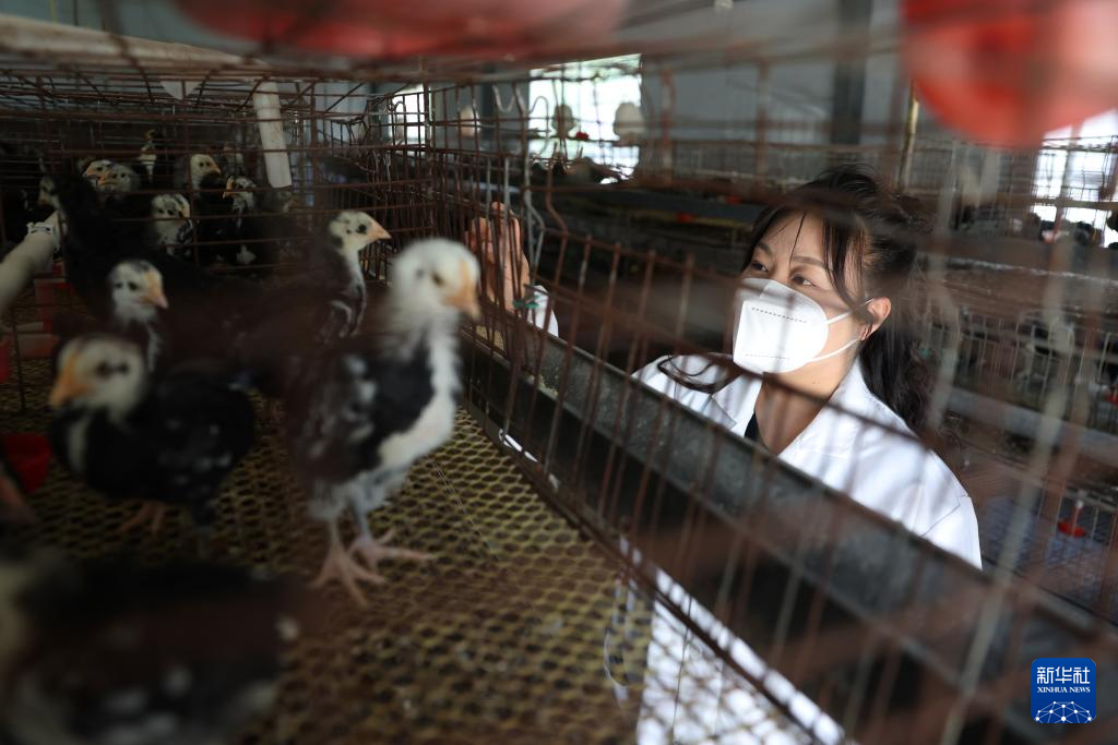 康县阳坝镇梅园太平山鸡养殖专业合作社负责人徐巍芹在孵化鸡舍查看鸡苗生长情况(4月22日摄)。