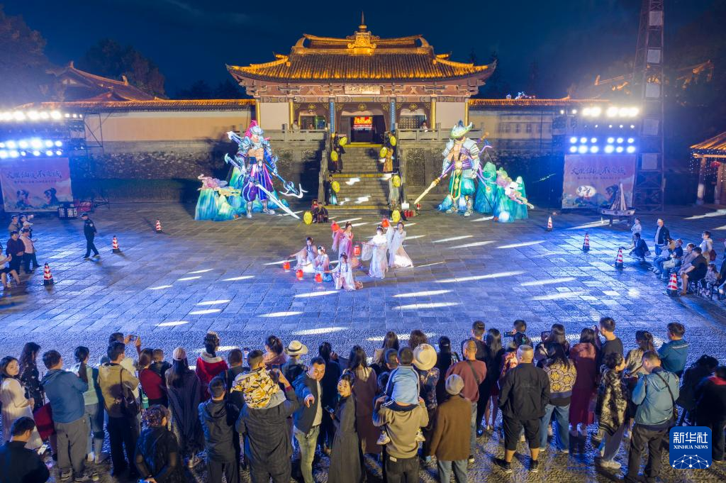 4月22日,游客在大理天龙八部城观看表演(无人机照片)。