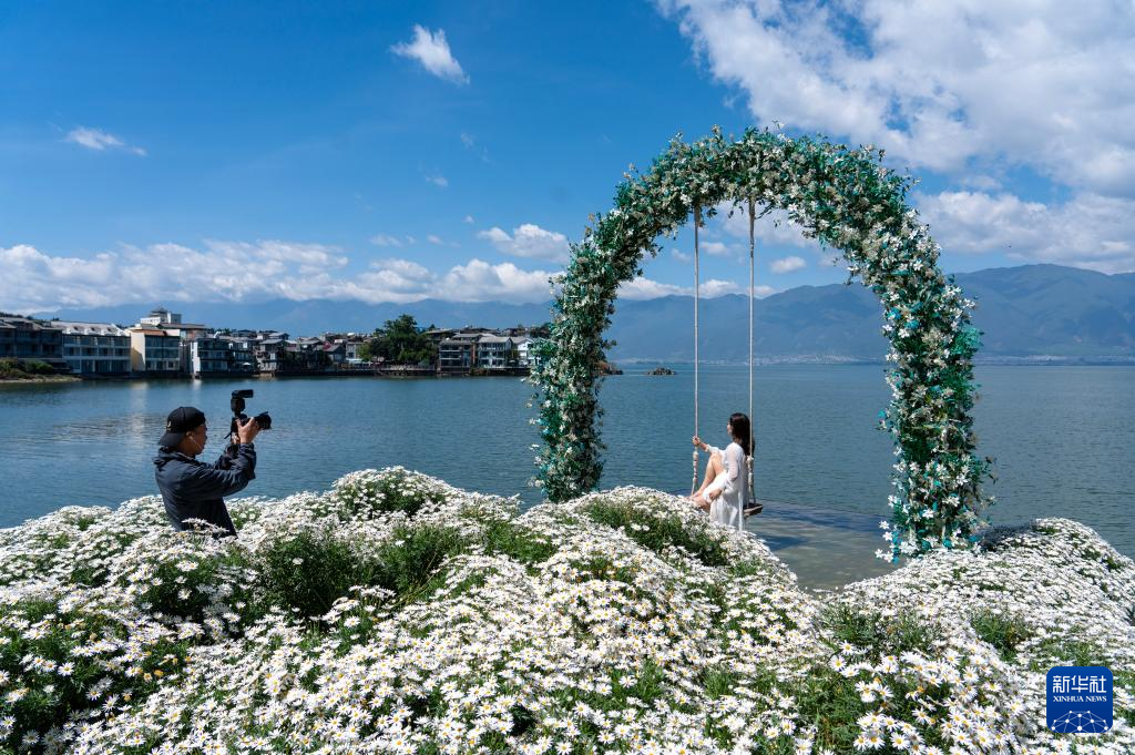 4月22日,一名游客在大理双廊古镇打卡拍照。