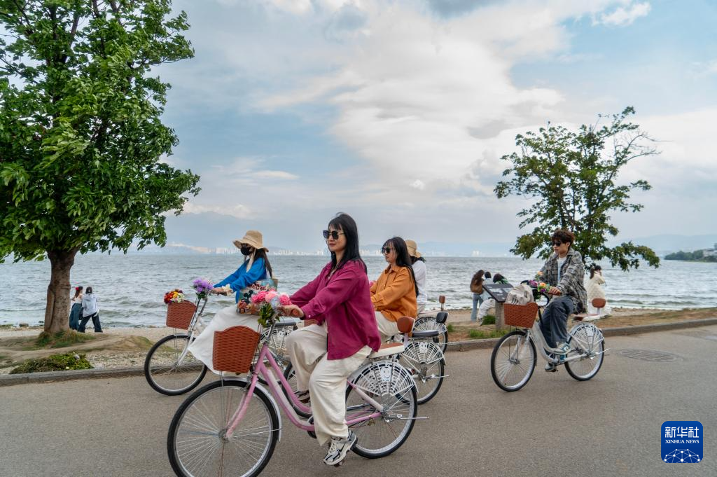 4月23日,几名来自广东的游客在大理洱海生态廊道骑行。