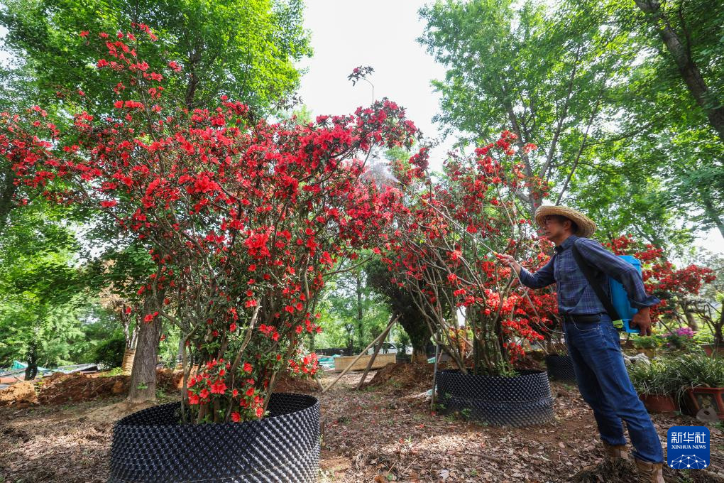 4月24日,农户在长兴县李家巷镇李家巷村的弁山锦园苗圃内养护盛开的杜鹃花。
