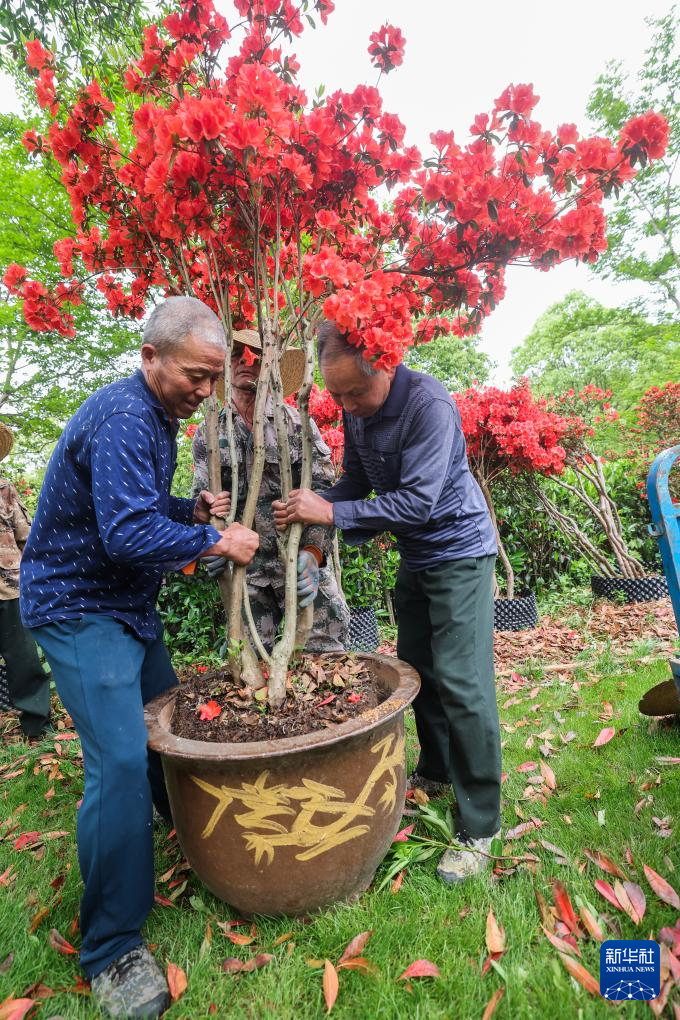 4月24日,农户在长兴县李家巷镇李家巷村的弁山锦园苗圃内移栽杜鹃花。