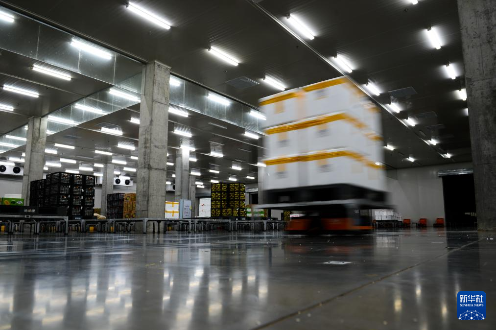 4月23日,在襄阳市樊城区好邻居生鲜物流中心,一台智能运送机器人在运输货物。
